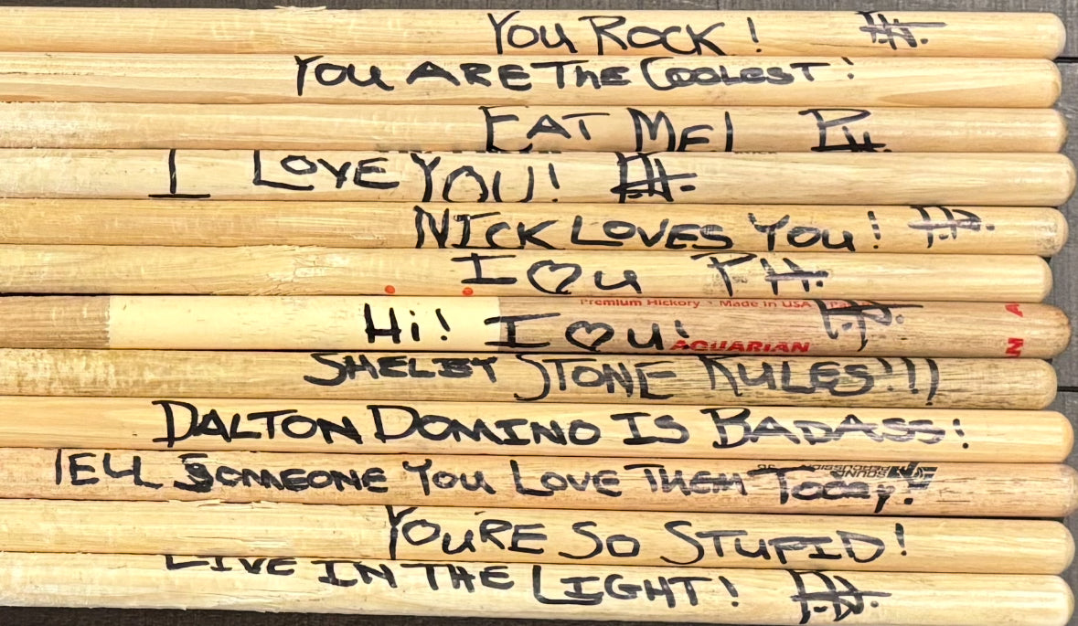PH Naffah, RCPM's kick ass drummer, destroys drumsticks on a regular basis.  Here is a batch of his Vic Firth sticks, beat up and retired so he decided to write some Stick Quips and sign them for anyone who might like to have one.  There are 12 sticks each with their own quip, only one of each, see below in the options to see what is available.  ¡Viva PH!