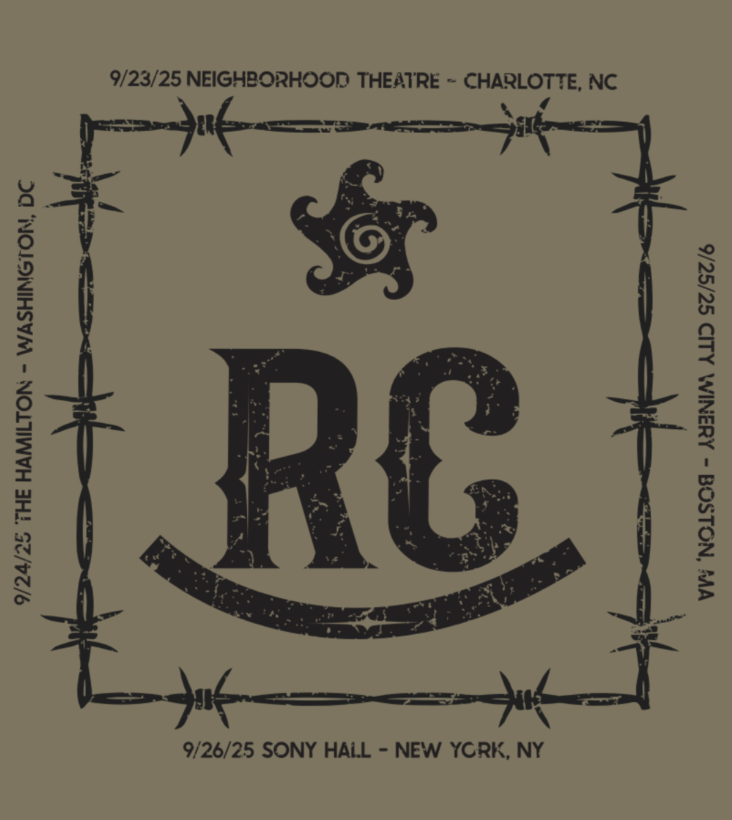 Roger Clyne's official cattle brand is a "rockin' R C".  This solo graphic highlights his brand and is framed by barbed wire with tour dates from him opening for Reckless Kelly in September 2025.   Heathered army green shirt with graphic on the front.  Available in M-2X.